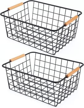 Cestas de almacenamiento de alambre YULIN JIAFU, cestas de alambre organizadoras con mangos de madera, cesta de alambre, organización y almacenamiento de despensa
