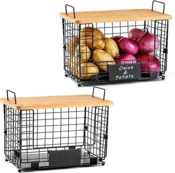 YULIN JIAFU Cesta de alambre apilable con tapas de bambú y etiquetas-Organizador de despensa y contenedores de almacenamiento