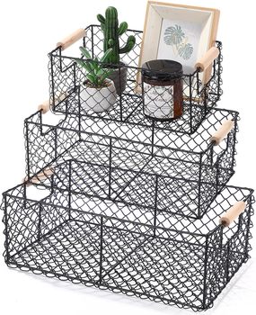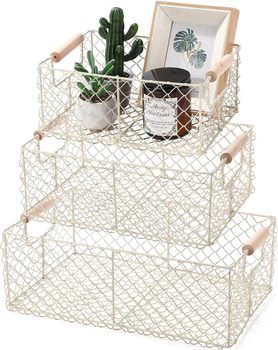 Cestas de almacenamiento de alambre YULIN JIAFU, cestas de alambre organizadoras con mangos de madera, cesta de alambre, organización y almacenamiento de despensa